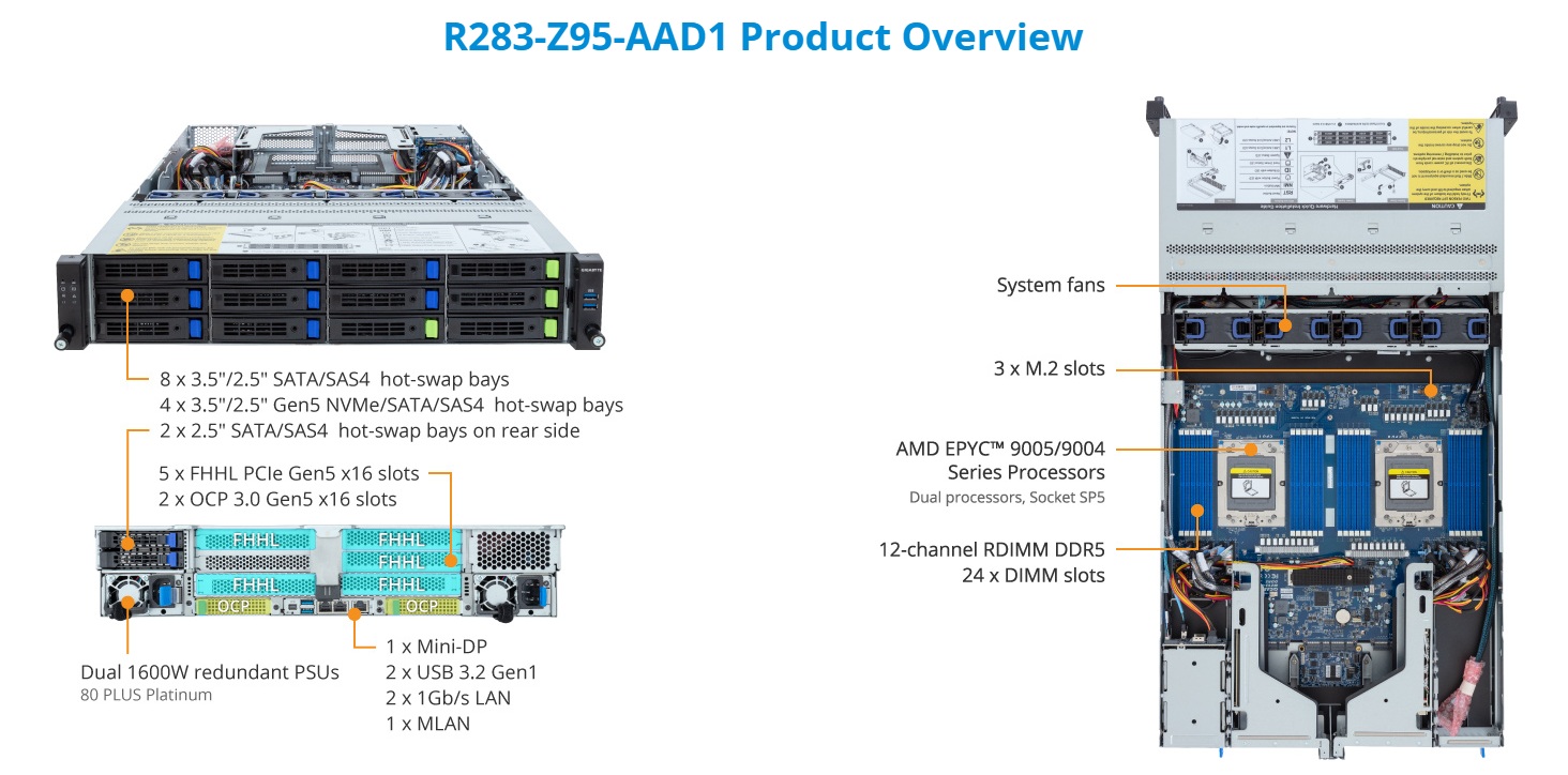 2U DP AMD EPYC™ 9004/5, 12*3,5"/2,5" H.S. SATA di cui 4*NVMe/SATA (SAS-4 supported) with expander + 2*2,5" SATA rear, 2*NVMe M.2 x4 - 24x DDR5 ECC-R - 5*PCIe x16 + 2 OCP - 2*1 Gb/s, 1 Management port - 1600W redundant Platinum Level - Standard Ship