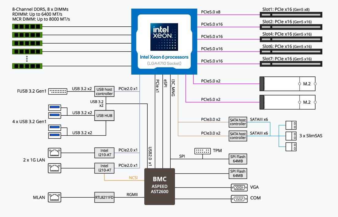 MB - UP - Intel Xeon 6 LGA4710,TDP up 350W, System on Chip, 8xDDR5 ECC REG up to 6400MT/s (MCR DIMM: up to 8000MT/s), PCIe: 4(x16), 1(x8) - 2 M2 NVME, LAN: 2xGbE RJ45 (I210-AT), 12xSATA, LAN management, KVM function, AST2600, ATX