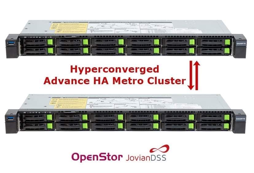 Descrizione: SOLUZIONE INTEL IN HA - 2 x 1U Hyperconverged ZFS OpenStor JovianDSS HA Metro Cluster (iSCSI/NFS/SMB/FC), 12 Bay 2.5'' Full NVMe, Dual Processor - 2x25Gbit SFP28 (100Gbit opt.) - 2x1GbE - Redundant 1600W