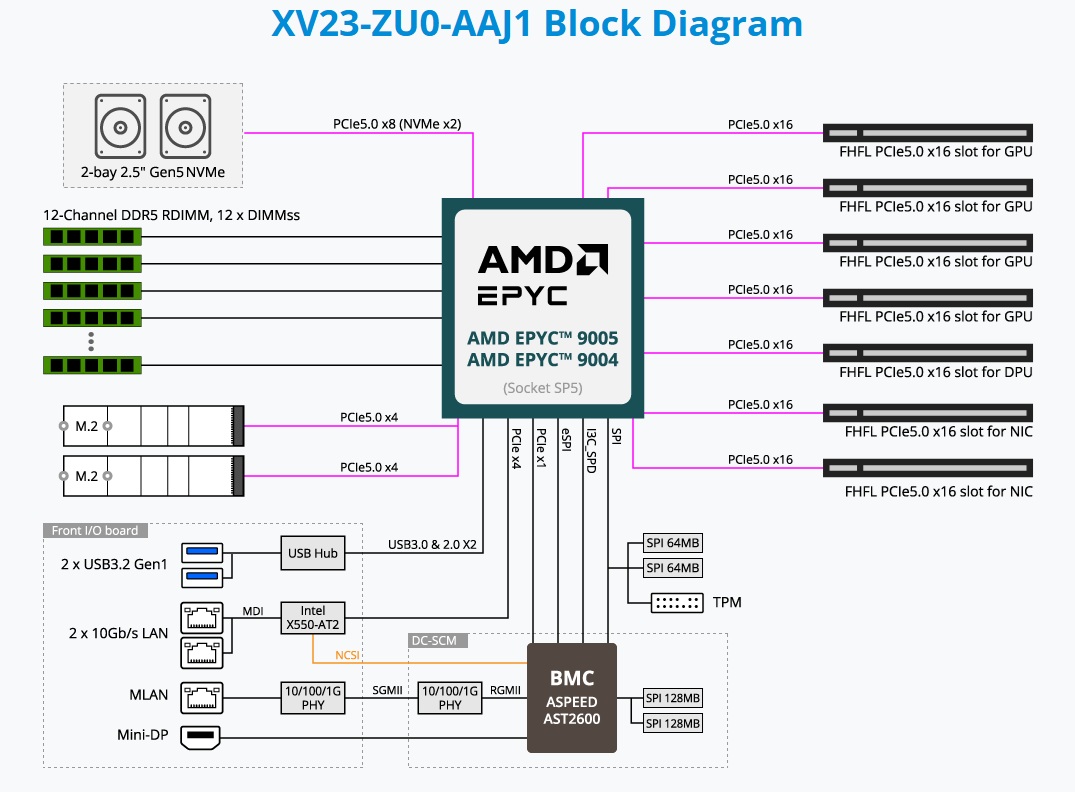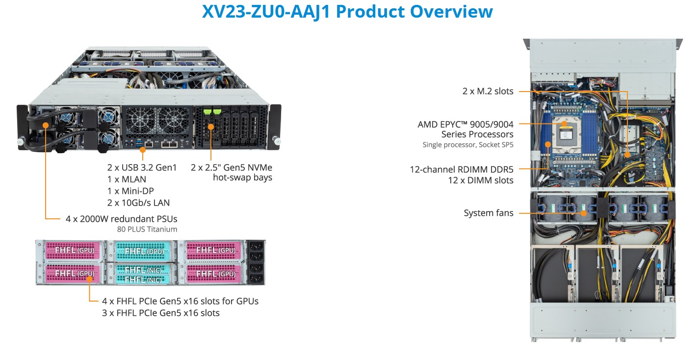 2U NVIDIA MGX™ Server UP AMD EPYC™ 9004/5, 2*2,5" H.S. NVMe/SATA (SAS-4 supported) - 12x DDR5 ECC-R - 7*PCIe x16 (4*GPUs) - 2*10Gb/s, 1 Management port - 4*2000W redundant Titanium Level - Standard Shipping