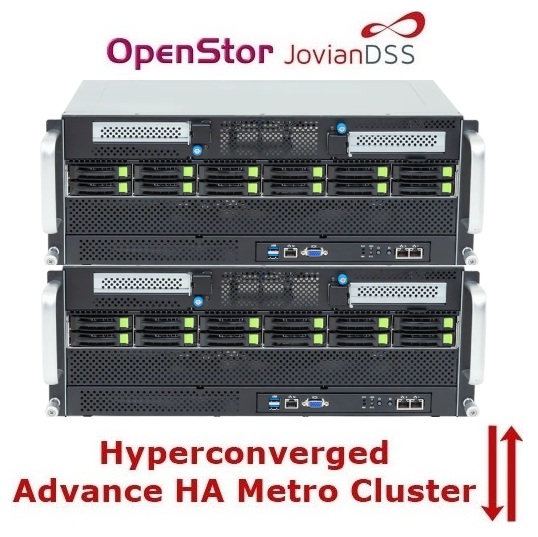 Descrizione: SOLUZIONE INTEL IN HA - 2 x 4U Hyperconverged ZFS OpenStor JovianDSS HA Metro Cluster (iSCSI/NFS/SMB/FC), 12 Bay 2.5'' Full NVMe, Dual Processor - 2x25Gbit SFP28 (100Gbit opt.) - 2x10GbE - 4* Redundant 3000W