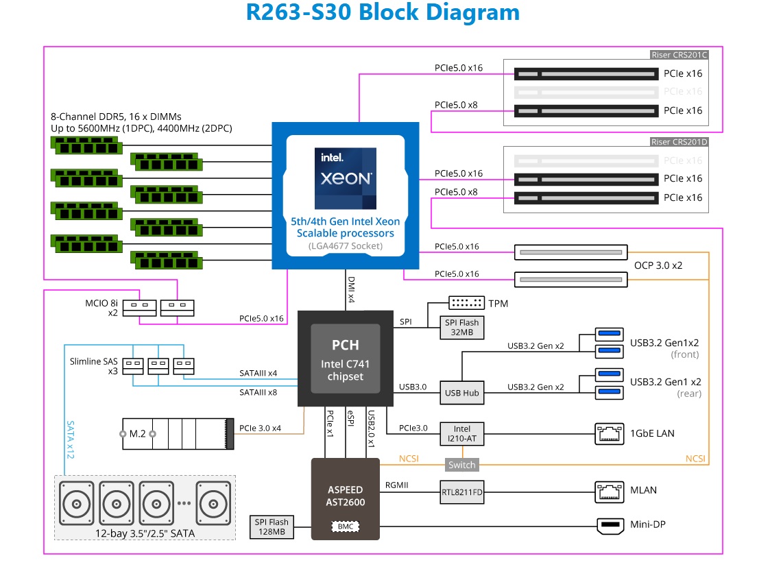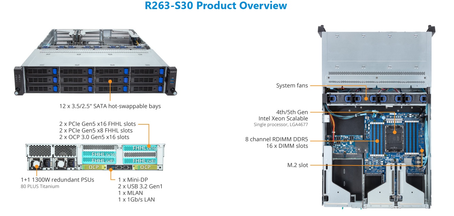 Descrizione: 2U - UP Xeon® LGA4677 up to 350W TDP, 12x3,5''/2,5'' HotSwap SATA - 16xDDR5 ECC-R - 4*PCIe 5.0 x16 FHHL, 2*OCP, 1 *GbE RJ45, Dedicated management LAN BMC + KVM - Up to 1300W Redundant Titanium Level