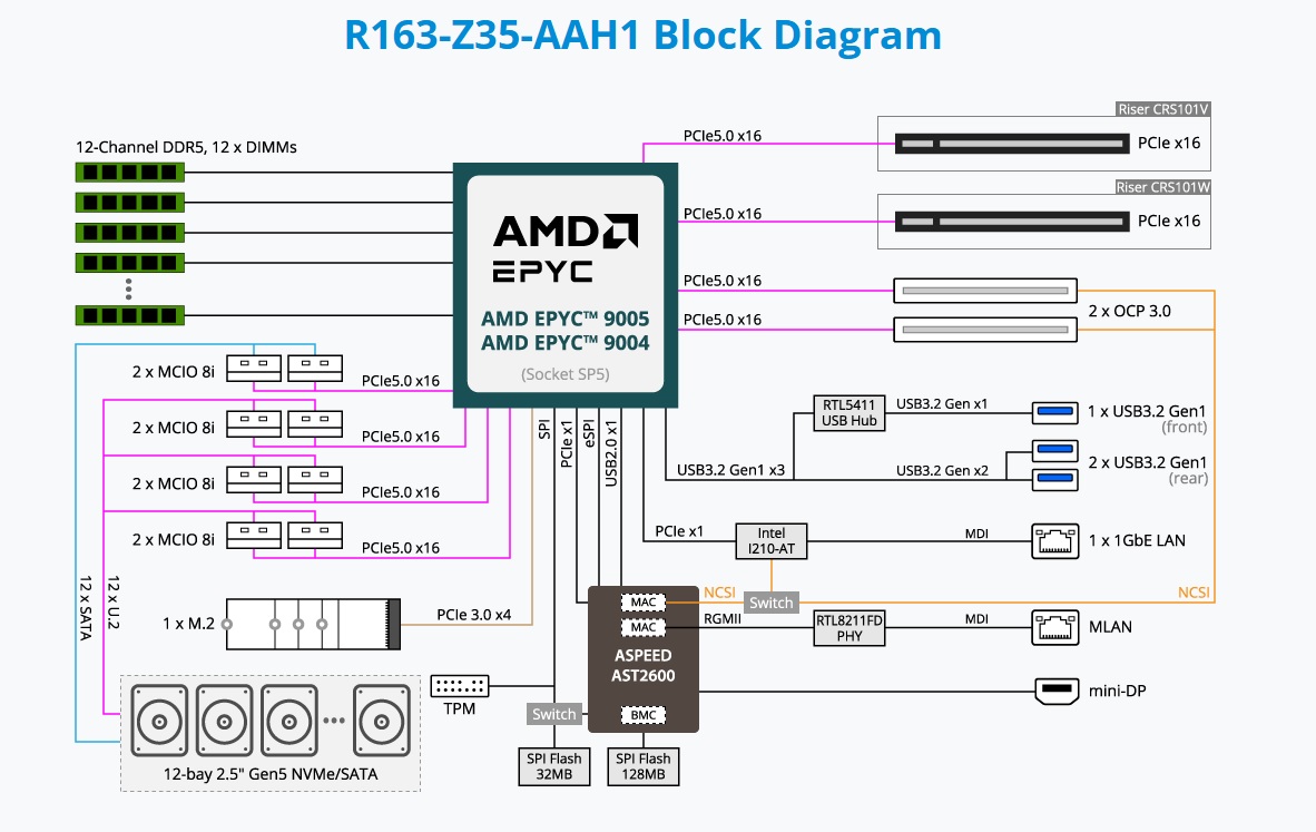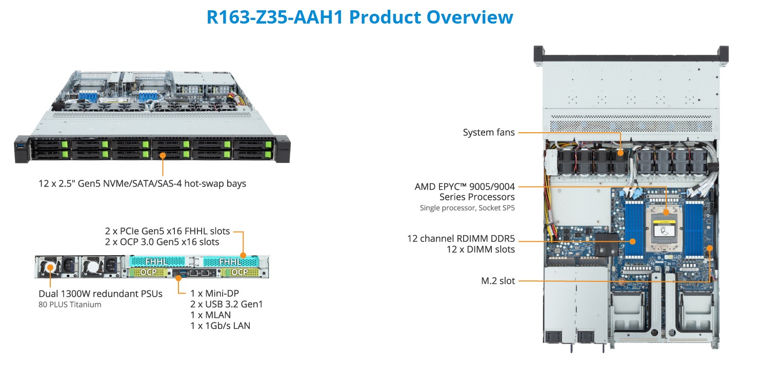 1U UP AMD EPYC™ 9004/5, 12*2,5" H.S. NVMe/SATA (SAS-4 supported), 1*NVMe M.2 x4 - 12x DDR5 ECC-R - 2*PCIe x16 + 2 OCP - 1*1Gb/s, 1 Management port - 1300W redundant Titanium Level - Quick Shipping